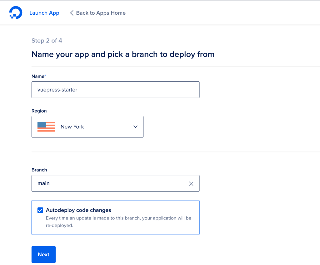 You can leave all the defaults on Step 2 unchanged. One of the most interesting options is “Autodeploy code changes”; when selected, this will let App Platform automatically redeploy your site whenever the main branch of your Github repository is updated. App Platform will perform the redeployment with zero downtime, and will automatically prevent deployments if builds don’t work: