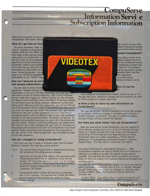 I’d take that old phone’s handset and push it into the rubber cups (acoustic coupler) of the modem. Then I’d load up CompuServe from a cartridge like this: