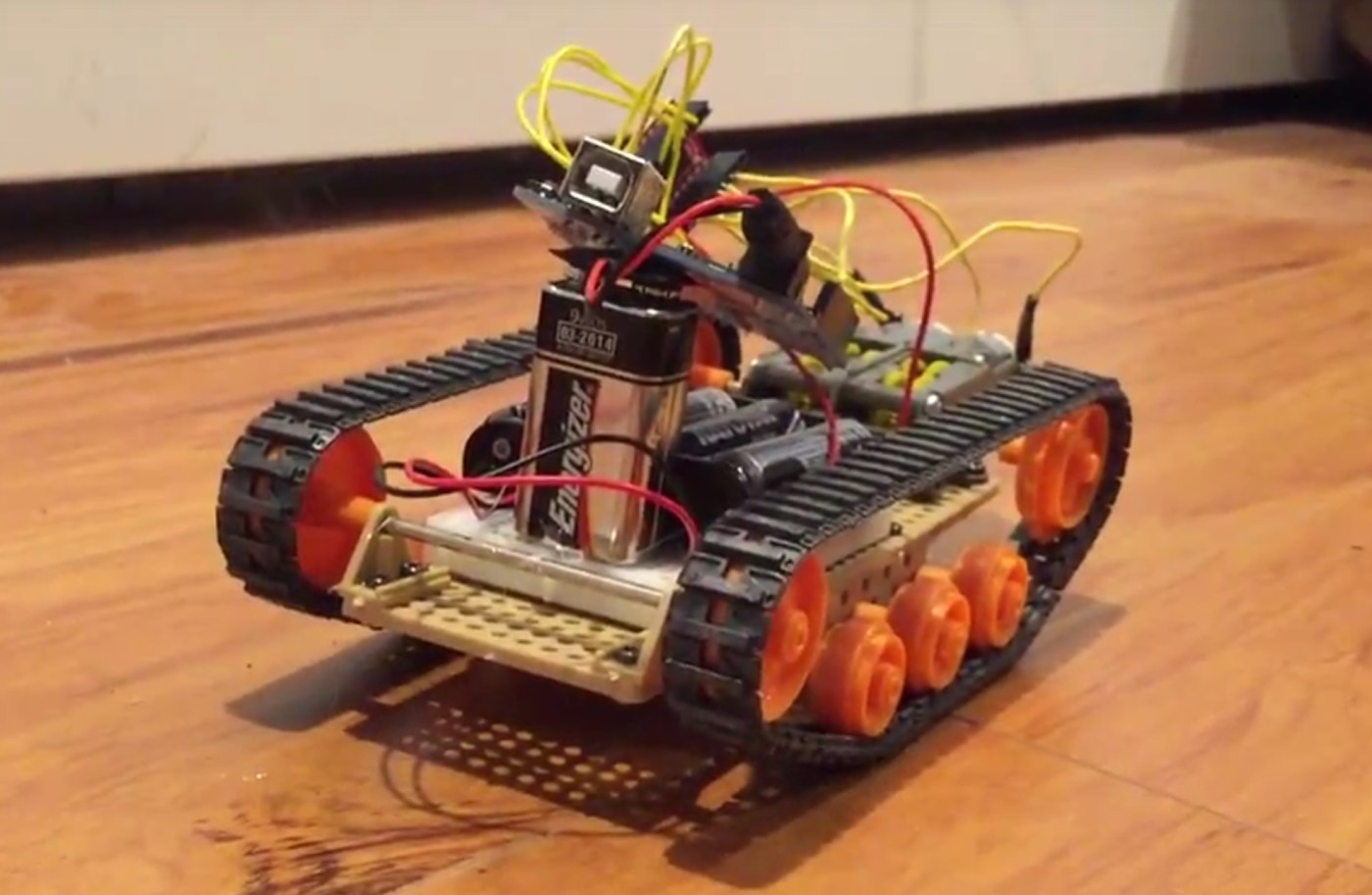 It may not look like much, but this is the first autonomous robot I've built. That board on top is an Arduino Uno that has a simple program to make the motors move forward, pause, then move backward. https://youtu.be/pq7lCPaNE6E?rel=0